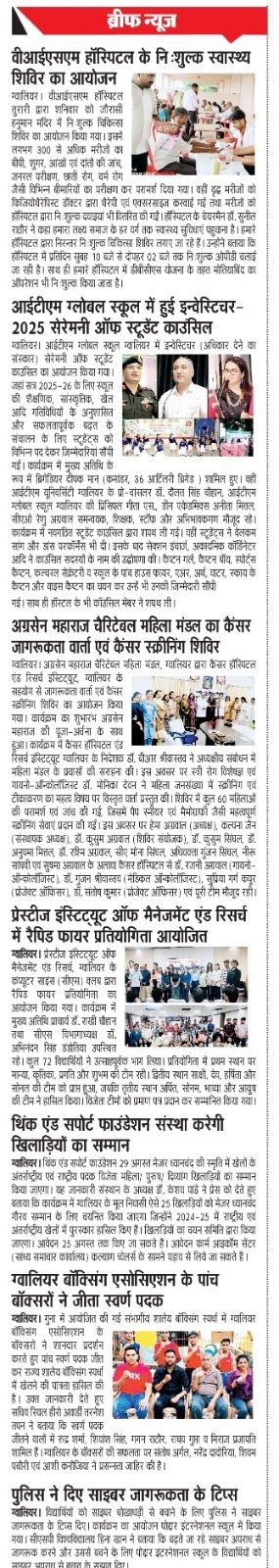 ग्वालियर। व्हीआईएसएम हॉस्पिटल तुरारी द्वारा आज दिनांक 23/08/2025 को जौरासी हुनमान मंदिर में निःशुल्क चिकित्सा शिविर का आयोजन किया गया। इस शिविर में लगभग 300 से अधिक मरीजों का परीक्षण किया गया। इस शिविर में बीपी, शुगर, ऑखों एवं दांतों की जॉच, जनरल परीक्षण, छाती रोग, चर्म रोग, जैसी विभिन्न बिमारियों का परीक्षण कर परामर्श दिया गया। इसके साथ शिविर में वृद्ध मरीजों को फिजियोथैरेपिस्ट डॉक्टर के द्वारा थैरेपी एवं एक्सरसाइज करवाई गई एवं मरीजों को हॉस्पिटल द्वारा निःशुल्क दवाँईया भी वितरित की गई। इस अवसर पर हॉस्पिटल के चेयरमैन डॉ. सुनील राठौर ने निःशुल्क लाभ ले रहें मरीजों को बताया कि स्वास्थ्य सेवा ही सबसे बड़ी मानव सेवा है। हमारा लक्ष्य समाज के हर वर्ग तक स्वास्थ्य सुविधाएँ पहुचाना है। हमारे हॉस्पिटल द्वारा निरन्तर निःशुल्क चिकित्सा शिविर लगाऐं जा रहें है। साथ ही उन्होनें यह भी बताया कि ग्रामीण और शहरी क्षेत्रों में स्वास्थ्य सुविधाओं का आभाव आज भी एक गंभीर चुनौती है। व्हीआईएसएम हॉस्पिटल का प्रयास है कि आमजन को गुणवत्तापूर्ण स्वास्थ्य सेवाऐं सहजता से उपलब्ध हों। हमारें द्वारा हॉस्पिटल में प्रतिदिन सुबह 10 बजे से दोपहर 02 बजे तक निःशुल्क ओपीडी चलाई जा रही है जिसका लाभ काफी मरीज उठा रहें है हमारे हॉस्पिटल में डीबीसीएस योजना के तहत मोतियाबिंद का ऑपरेशन भी निःशुल्क किया जाता है। इस मौके पर व्हीआईएसएम हॉस्पिटल की डॉक्टर्स टीम एव नर्सिंग स्टॉफ मौजूद रहें