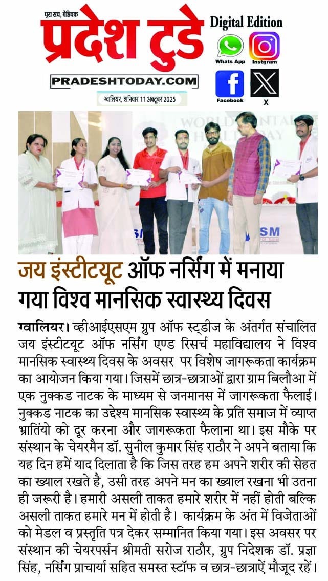 व्हीआईएसएम ग्रुप ऑफ स्ट्डीज के अंतर्गत संचालित जय इंस्टीट्यूट ऑफ नर्सिंग एण्ड रिसर्च महाविद्यालय ने विश्व मानसिक स्वास्थ्य दिवस के अवसर पर विशेष जागरूकता कार्यक्रम का आयोजन किया गया। जिसमें छात्र-छात्राओं द्वारा ग्राम बिलौआ में एक नुक्कड नाटक के माध्यम से जनमानस में जागरूकता फैलाई। नुक्कड नाटक का उद्देश्य मानसिक स्वास्थ्य के प्रति समाज में व्याप्त भ्रातियो को दूर करना और जागरूकता फैलाना था। इस मौके पर संस्थान के चेयरमैन डॉ. सुनील कुमार सिंह राठौर ने अपने बताया कि यह दिन हमें याद दिलाता है कि जिस तरह हम अपने शरीर की सेहत का ख्याल रखते है, उसी तरह अपने मन का ख्याल रखना भी उतना ही जरूरी है। हमारी असली ताकत हमारे शरीर में नहीं होती बल्कि असली ताकत हमारे मन में होती है। कार्यक्रम के अंत में विजेताओं को मेडल व प्रस्तृति पत्र देकर सम्मानित किया गया। इस अवसर पर संस्थान की चेयरपर्सन श्रीमती सरोज राठौर, ग्रुप निदेशक डॉ. प्रज्ञा सिंह, नर्सिंग प्राचार्या सहित समस्त स्टॉफ व छात्र-छात्राएं मौजूद रहें।